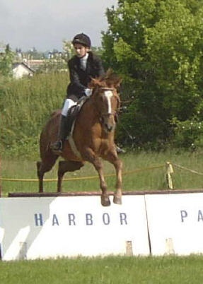 |  | |  | A képen Murmann Anett - élete első versenyén - ugratja Linda nevű, nem éppen megbízhatónak mondható lovát. (vers404) |