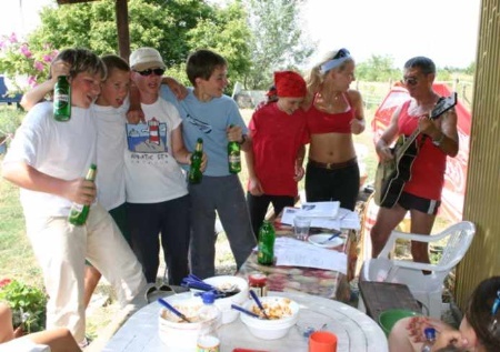 |  | 127_2718i.jpg |  | A táborzászló levonása előtt nótáztunk egyet, Lajos gitározott, Zsófi vitte a prímet Julival és a 13-ak bandája (üres!) sörösüveggel a kezében eljátszotta a gogo-boyok szerepét: itt éppen a "8 óra munka, 8 óra pihenés" megy... Ez utóbbi ránk fér, nagyon sokat dolgoztunk a héten és nagyon elfáradtunk, de hát ezért jöttünk! Legközelebb is várunk mindenkit! Az idén már csak egy táborunk lesz, augusztus 7-től. |