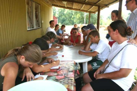 Voltak visszatérők, úgymint a 13-asok (négy 13 éves fiú volt a csapatban!) kemény magja, de Lajosnak is nagyon örültünk, csakúgy mint Eszternek, Nórinak és Andriskának. És voltak "első bálozók": Vanda, Fruzsi, Dóri és Rita. Nagyon megviselt bennünket a meleg, a tábor alatt kb. 80-90 liter jaffa- és málnaszörp fogyott, az egyéb italfogyasztás mellett. A lovaglást és a kerékpározást is bírta a csapat, bár csütörtökön érdekes dolgok történtek: sorra lapultak le a kerékpárok kerekei... (az egyik fiú valóságos defektje adta az ötletet: engedjük le a gumikat), de a táborvezetők éberek voltak és János bácsi senkit nem volt hajlandó magával vinni kocsival, kivéve aki erre valóban rászorult (mág azon az áron sem, hogy ezért volt "felszólamolás"). A csapat ezúttal is remek volt: mindenki sokat fejlesztett a lovaglás tudásán és ez volt az egyik cél, a másik az, hogy kellemesen töltsük a hetet. Mindkettő sikerült!!! |